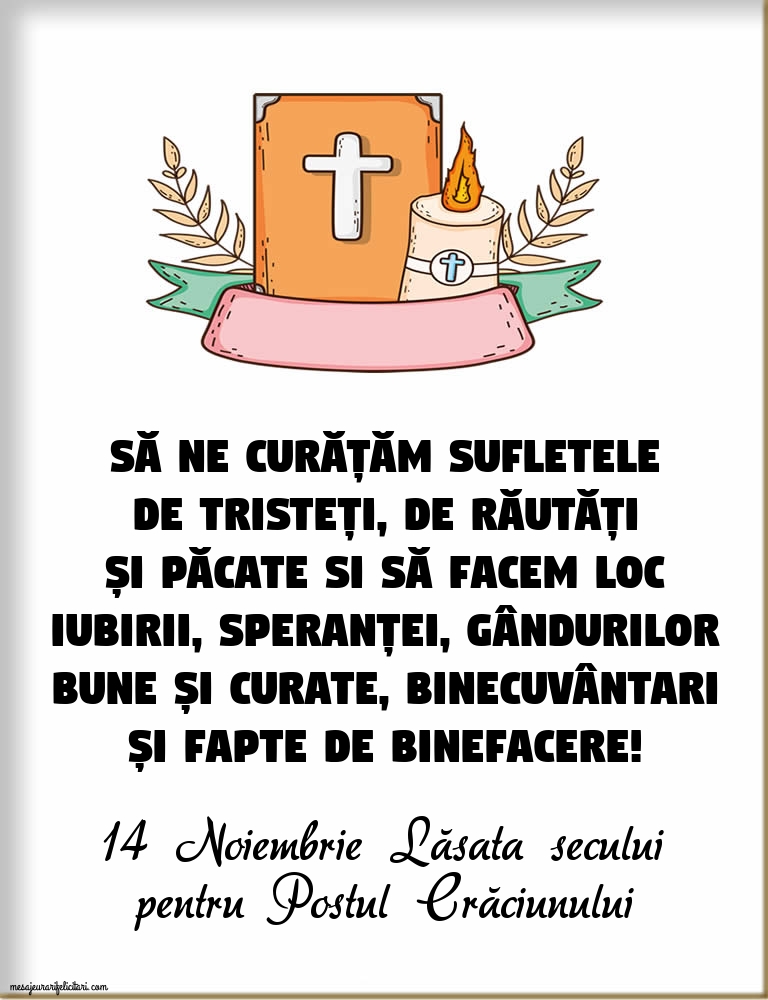 Să ne curățăm sufletele de tristeți, de răutăți și păcate si să facem loc iubirii, speranței, gândurilor bune și curate, binecuvântari și fapte de binefacere! 14 Noiembrie Lăsata secului pentru Postul Crăciunului