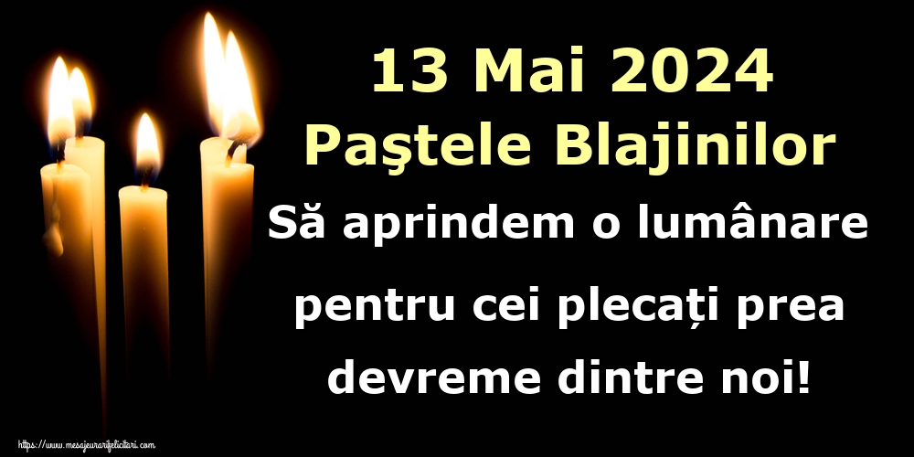 Descarca felicitarea - Imagini de Paştele Blajinilor - 13 Mai 2024 Paştele Blajinilor Să aprindem o lumânare pentru cei plecați prea devreme dintre noi! - mesajeurarifelicitari.com