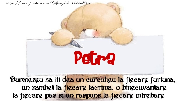Petra. Alaturi de tine, la bine si la greu! - Felicitari de prietenie pentru Petra - Se apropie ziua de nume sau de nastere a cuiva drag? Aici gasesti felicitari cu nume pentru zilele de nume, zile onomastice, felicitari de dragoste si multe altele. Trimite acum felicitari si ganduri frumoase celor dragi!