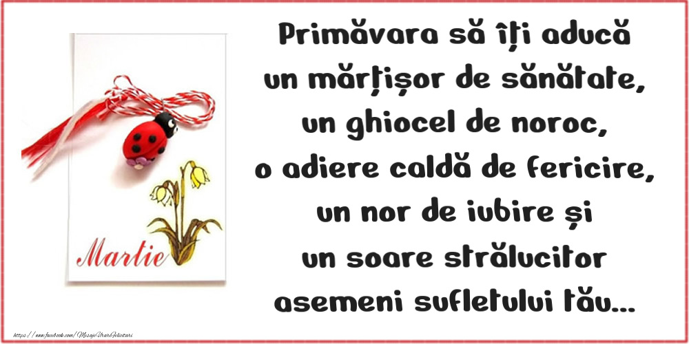 Un mesaj frumos cu mărțișor clasic cu buburuză și ghiocei