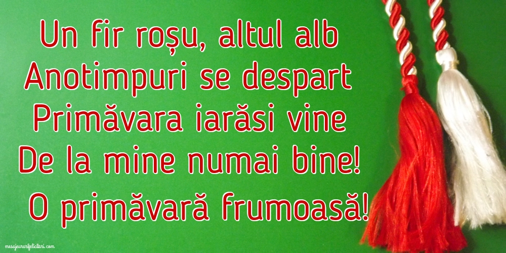 Un fir roșu, altul alb Anotimpuri se despart Primăvara iarăși vine De la mine numai bine! O primăvară frumoasă! ~ mărțișor cu inimioră