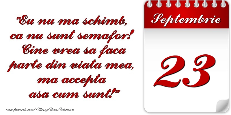 Eu nu mă schimb, că nu sunt semafor! Cine vrea sa faca parte din viaţa mea, ma accepta asa cum sunt! 23 Septembrie