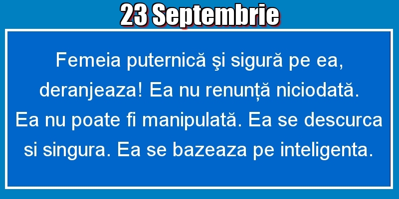 23.Septembrie Femeia puternică şi sigură pe ea, deranjeaza! Ea nu renunţă niciodată. Ea nu poate fi manipulată. Ea se descurca si singura. Ea se bazeaza pe inteligenta.