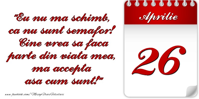 Eu nu mă schimb, că nu sunt semafor! Cine vrea sa faca parte din viaţa mea, ma accepta asa cum sunt! 26 Aprilie