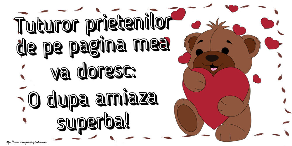 Tuturor prietenilor de pe pagina mea va doresc: O dupa amiaza superba! ~ urs simpatic cu inimioare