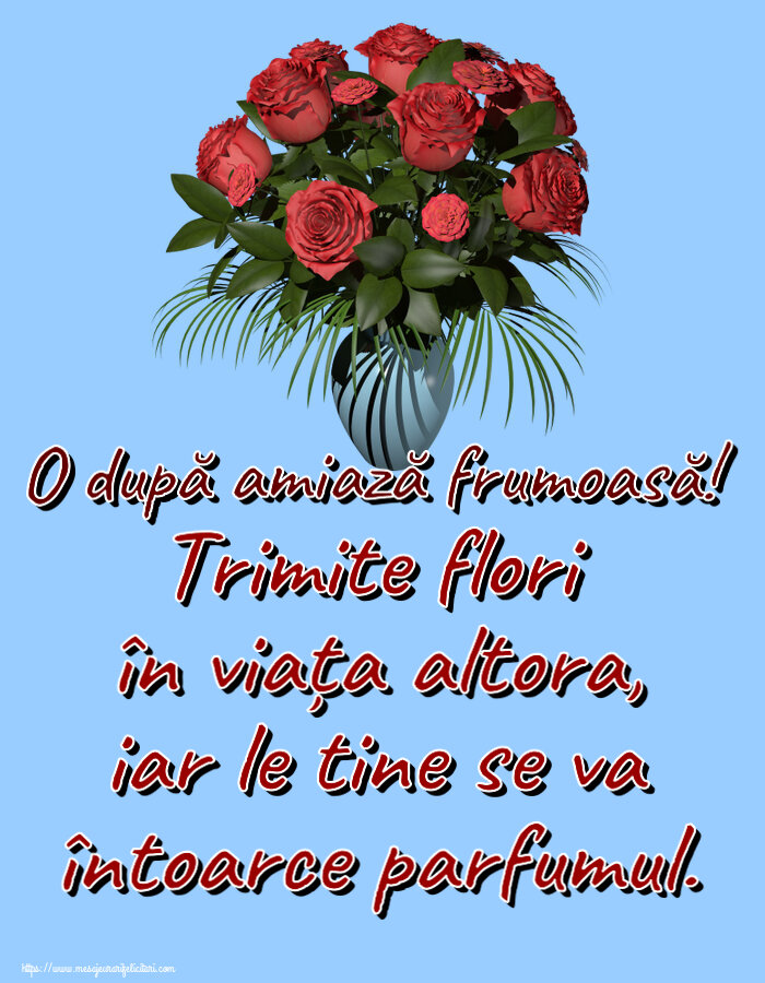 Un buchet de flori îți dăruiesc Și o după amiază super îți doresc. Felicitari de amiaza, imagini pe care le poti trimite la amiaza sau pranz prietenilor si familiei. O după amiază plăcută!