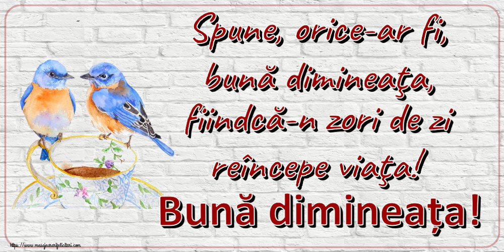 Spune, orice-ar fi, bună dimineaţa, fiindcă-n zori de zi reîncepe viaţa! Bună dimineața! ~ cană de cafea cu pasărele