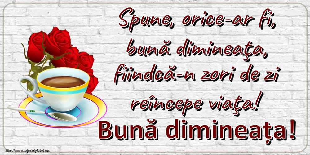 Descarca felicitarea - Felicitari de buna dimineata - ☕ Spune, orice-ar fi, bună dimineaţa, fiindcă-n zori de zi reîncepe viaţa! Bună dimineața! ~ cafea și buchet de trandafiri - mesajeurarifelicitari.com