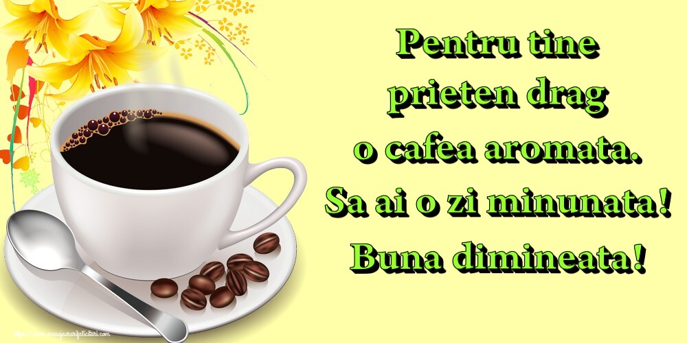 Pentru tine prieten drag o cafea aromata. Sa ai o zi minunata! Buna dimineata! Felicitari de buna dimineata, felicitari haioase de buna dimineata, felicitari pentru cafea, felicitari cu cafea, felicitari de dimineata facebook