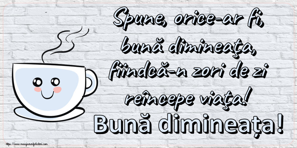 Spune, orice-ar fi, bună dimineaţa, fiindcă-n zori de zi reîncepe viaţa! Bună dimineața! Felicitari de buna dimineata, felicitari haioase de buna dimineata, felicitari pentru cafea, felicitari cu cafea, felicitari de dimineata facebook