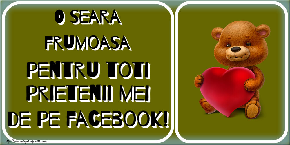 O seara frumoasa pentru toti prietenii mei de pe facebook! Felicitari de buna seara, felicitari haioase de buna seara, felicitari de buna seara pentru prieten si prietena, felicitari de buna seara pentru cei dragi, felicitari de seara facebook
