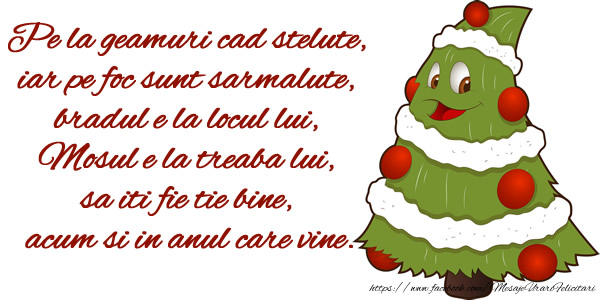 Pe la geamuri cad stelute, iar pe foc sunt sarmalute, iar bradul e la locul lui, mosul e la treaba lui, sa ne fie noua bine, iaca si Craciunul vine. Craciun Fericit.