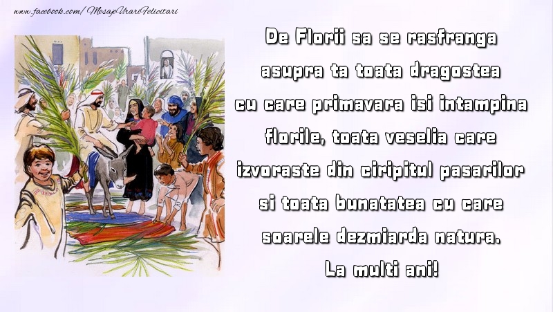 La mulți ani pentru toți cei care poartă nume de floare! Duminica Floriilor (sau Floriile) este o sarbatoare crestina fara data exacta, comemorata întotdeauna in ultima duminica dinaintea Pastelui. Aici gasesti felicitari de Florii pe care poti trimite florilor din viata ta.