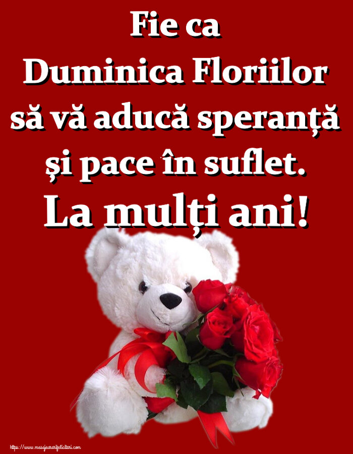 Un buchet de flori pentru toate florile! La mulți ani de Florii! Duminica Floriilor (sau Floriile) este o sarbatoare crestina fara data exacta, comemorata întotdeauna in ultima duminica dinaintea Pastelui. Aici gasesti felicitari de Florii pe care poti trimite florilor din viata ta.