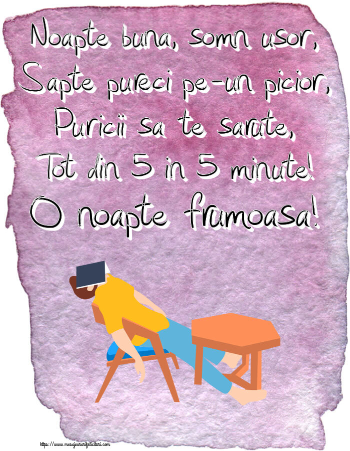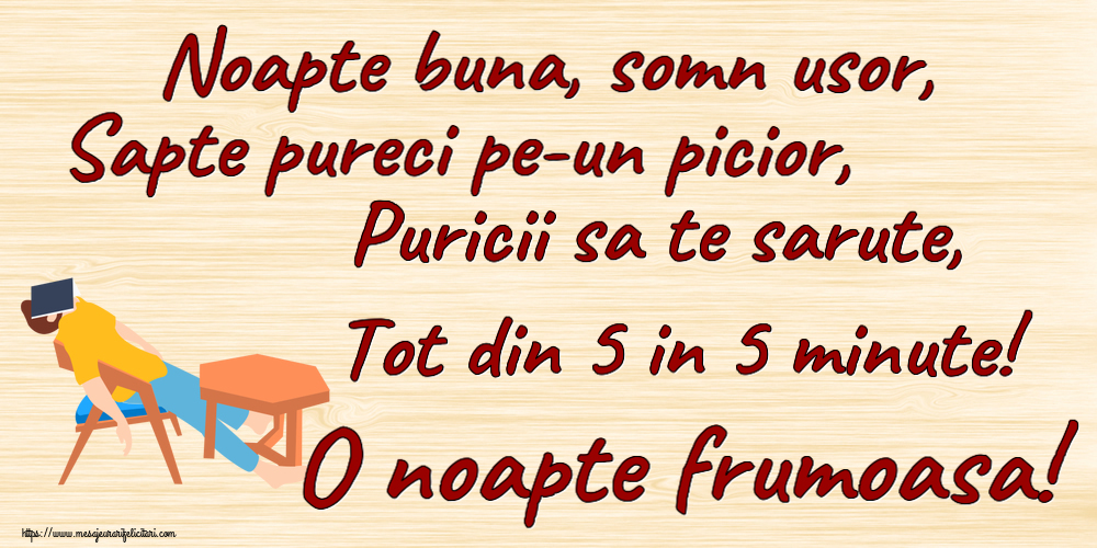 Noapte buna, somn usor, Sapte pureci pe-un picior, Puricii sa te sarute, Tot din 5 in 5 minute! O noapte frumoasa! Felicitari de noapte buna, felicitari haioase de noapte buna, felicitari pentru cafea, felicitari cu cafea, felicitari de noapte buna facebook