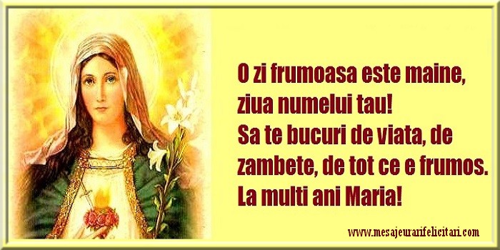 Principala sarbatoare a Mariei este la 15 august Adormirea Maicii Domnului sau Sfanta Maria Mare iar pe 8 septembrie se sarbatoreste Nasterea Maicii Domnului sau Sfanta Maria Mica. Aici gasiti felicitari de Sfanta Maria, felicitari pentru cei care poarte numele Sfintei Maria