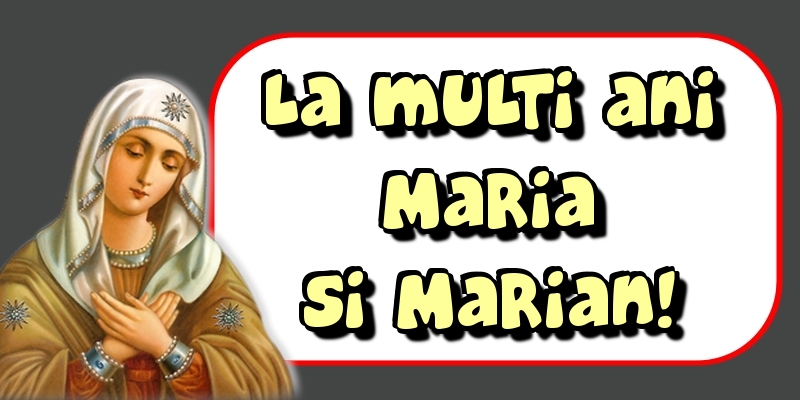La multi ani Maria si Marian! Principala sarbatoare a Mariei este la 15 august Adormirea Maicii Domnului sau Sfanta Maria Mare iar pe 8 septembrie se sarbatoreste Nasterea Maicii Domnului sau Sfanta Maria Mica. Aici gasiti felicitari de Sfanta Maria, felicitari pentru cei care poarte numele Sfintei Maria