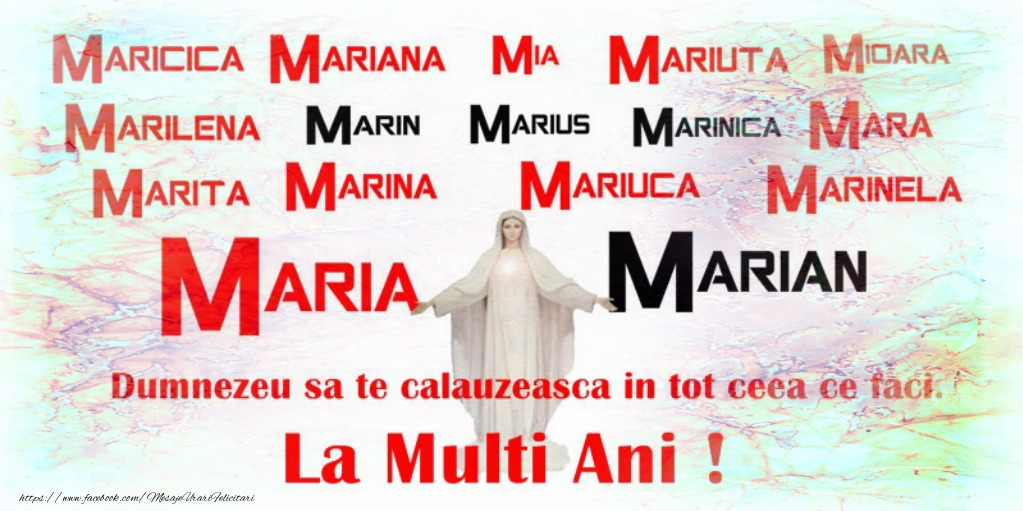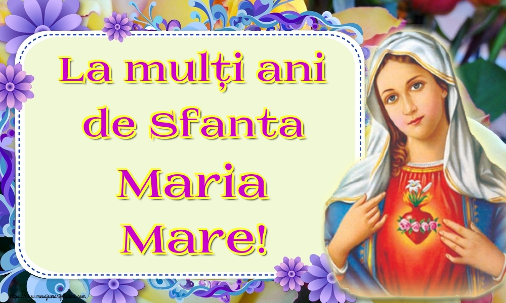 La mulți ani de Sfanta Maria Mare! Principala sarbatoare a Mariei este la 15 august Adormirea Maicii Domnului sau Sfanta Maria Mare iar pe 8 septembrie se sarbatoreste Nasterea Maicii Domnului sau Sfanta Maria Mica. Aici gasiti felicitari de Sfanta Maria, felicitari pentru cei care poarte numele Sfintei Maria