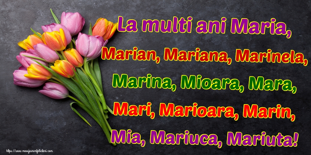 La multi ani Maria, Marian, Mariana, Marinela, Marina, Mioara, Mara, Mari, Marioara, Marin, Mia, Mariuca, Mariuta! Principala sarbatoare a Mariei este la 15 august Adormirea Maicii Domnului sau Sfanta Maria Mare iar pe 8 septembrie se sarbatoreste Nasterea Maicii Domnului sau Sfanta Maria Mica. Aici gasiti felicitari de Sfanta Maria, felicitari pentru cei care poarte numele Sfintei Maria