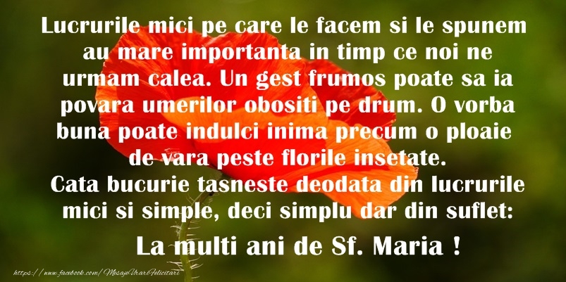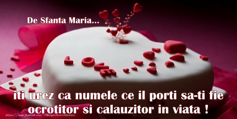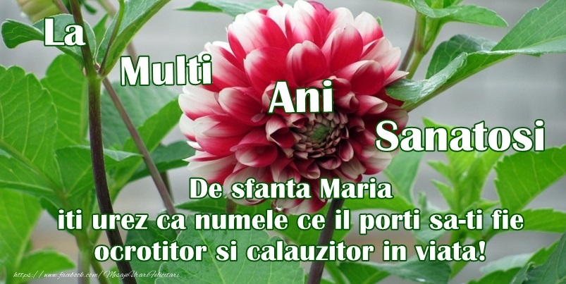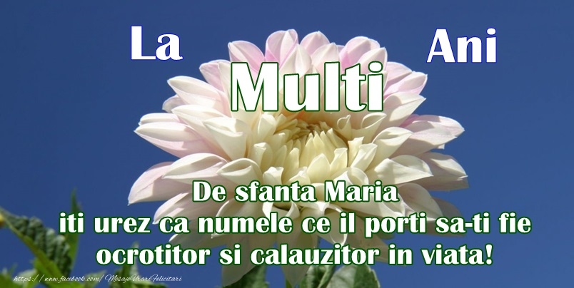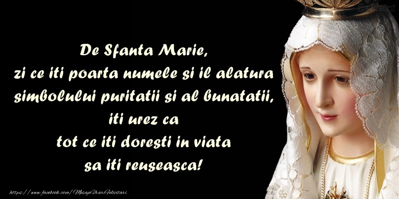 Principala sarbatoare a Mariei este la 15 august Adormirea Maicii Domnului sau Sfanta Maria Mare iar pe 8 septembrie se sarbatoreste Nasterea Maicii Domnului sau Sfanta Maria Mica. Aici gasiti felicitari de Sfanta Maria, felicitari pentru cei care poarte numele Sfintei Maria