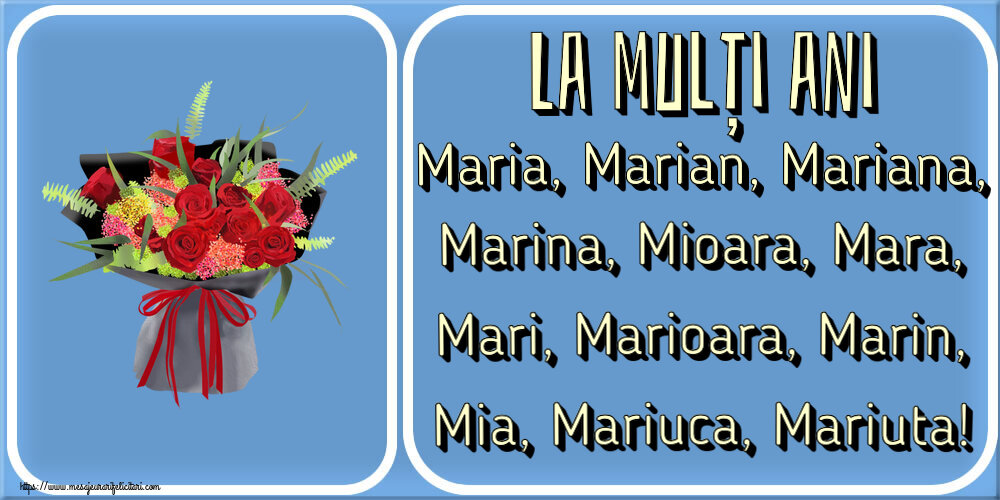 La mulți ani Maria, Marian, Mariana, Marina, Mioara, Mara, Mari, Marioara, Marin, Mia, Mariuca, Mariuta! ~ trandafiri roșii și garoafe