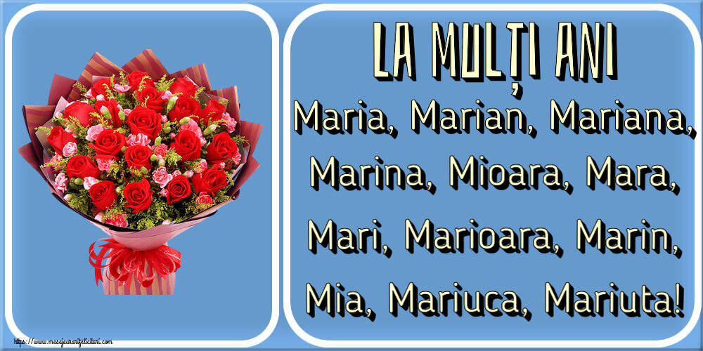 La mulți ani Maria, Marian, Mariana, Marina, Mioara, Mara, Mari, Marioara, Marin, Mia, Mariuca, Mariuta! ~ trandafiri roșii și garoafe