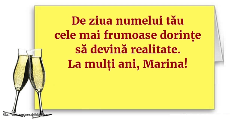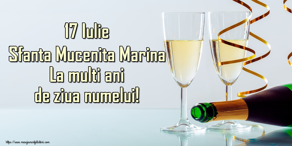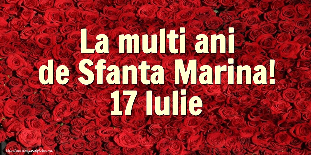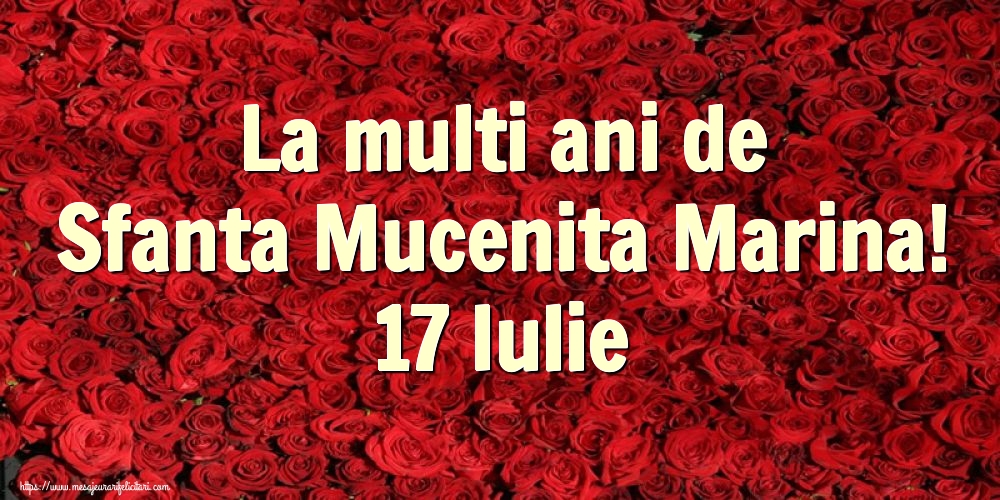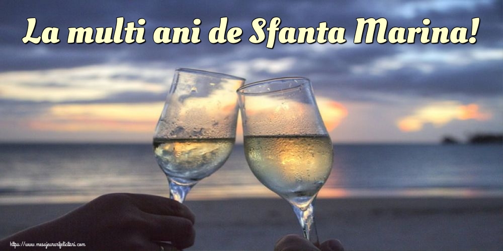 Fie ca Sarbatoarea Sfintei Marina sa va aduca in inimi pace, iubire, bucurie si fericire! De ziua Sfintei Marina, Ca-i porti frumosul nume, Eu iti urez tot ce-i mai bun Si mai frumos pe lume. La multi ani! La multi ani si multa sanatate pentru toti cei care poarta numele Sfintei Marina! La multi ani pentru toti prietenii mei de pe facebook care poarta numele Sfintei Marina! Fie ca Sf. Marina, sa te ocroteasca, sa-ti calauzeasca pasii si sa-ti lumineze calea. La multi ani! Fie ca Sfanta Marina sa va aduca pace, iubire, bucurie si fericire in mijlocul familiei!