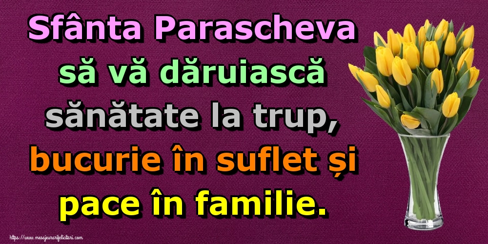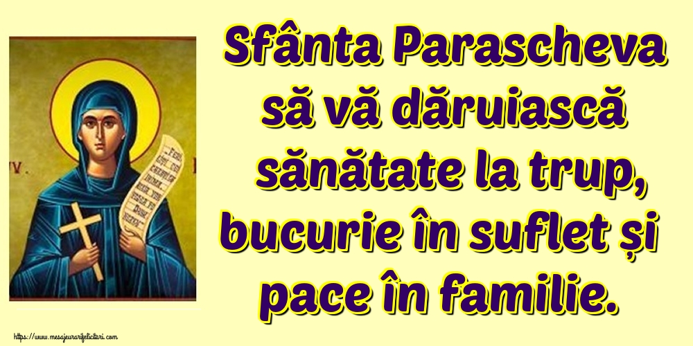 Sfânta Parascheva să vă dăruiască sănătate la trup, bucurie în suflet și pace în familie. Sfanta Cuvioasa Parascheva, ocrotitoarea Moldovei, este o sarbatoare foarte importanta pentru romani, iar moastele Sfintei se afla in Catedrala Mitropolitana din Iasi de peste 250 de ani, sarbatorita pe 14 octombrie. Aici gasiti felicitari de sfanta Parascheva, imagini de Sfanta Parascheva, felicitari pentru cei care poarte numele Sfantei Parascheva