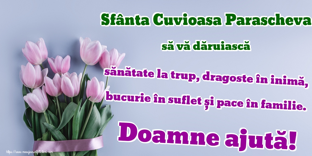 Sfânta Cuvioasa Parascheva să vă dăruiască sănătate la trup, dragoste în inimă, bucurie în suflet și pace în familie. Doamne ajută! Sfanta Cuvioasa Parascheva, ocrotitoarea Moldovei, este o sarbatoare foarte importanta pentru romani, iar moastele Sfintei se afla in Catedrala Mitropolitana din Iasi de peste 250 de ani, sarbatorita pe 14 octombrie. Aici gasiti felicitari de sfanta Parascheva, imagini de Sfanta Parascheva, felicitari pentru cei care poarte numele Sfantei Parascheva