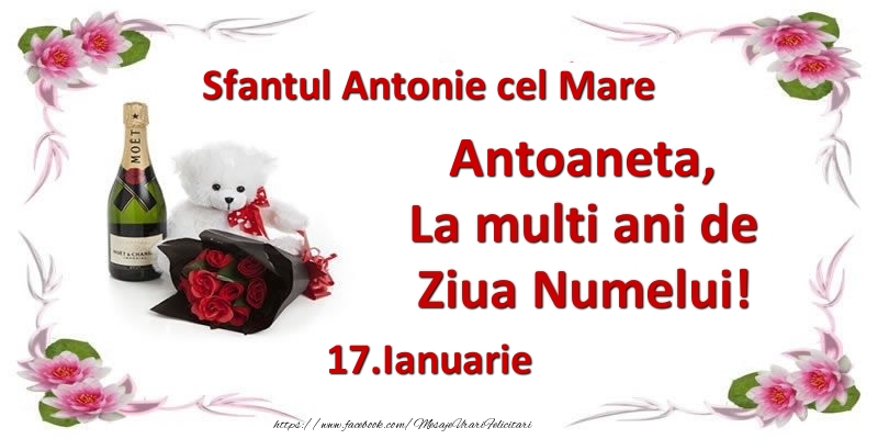 Sfantul Antonie cel Mare este praznuit de catre Biserica Ortodoxa in data de 17 Ianuarie in fiecare an. Trimite si tu un gand frumos intr-o felicitare tuturor care porta numele sfantului Antonie!