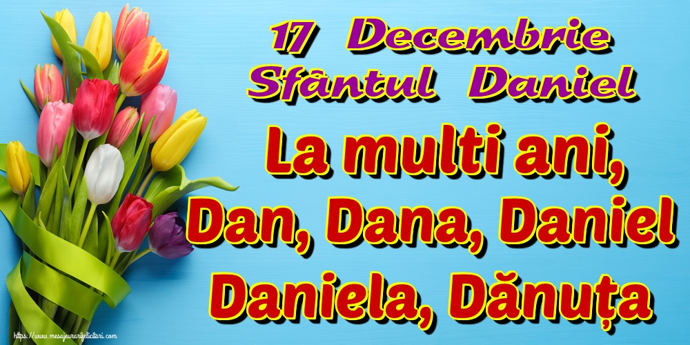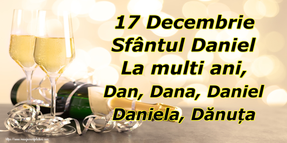 Sfantul Daniel este praznuit de catre Biserica Ortodoxa in data de 17 decembrie in fiecare an. Trimite si tu un gand frumos intr-o felicitare tuturor care porta numele sfantului Daniel! - Cele mai apreciate felicitari de Sfantul Daniel: 17 Decembrie