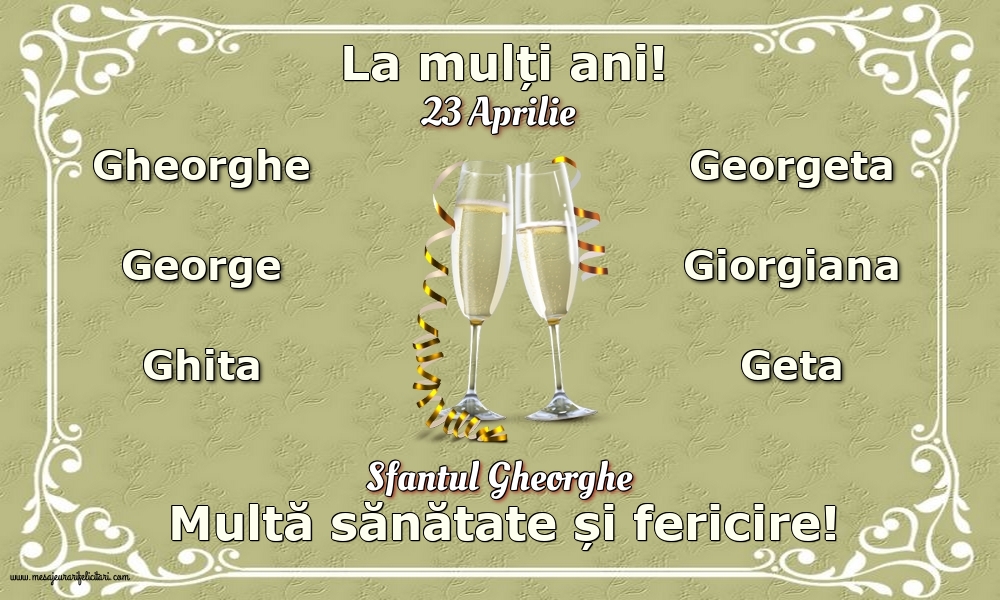 23 Aprilie La multi ani de Sarbatoarea Sfantului Gheorghe! In fiecare an, la 23 aprilie, il praznuim pe Sfantul Mare Mucenic Gheorghe, purtatorul de biruinta. Sfantul Gheorghe s-a nascut in Capadocia, din parinti crestini. Aici gasesti felicitari de sfantul Gheorghe, felicitari pentru cei care poarte numele Sfantului Gheorghe. La multi ani de Sfantul Gheorghe!