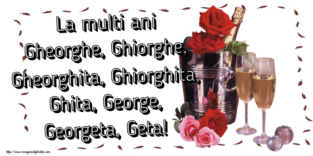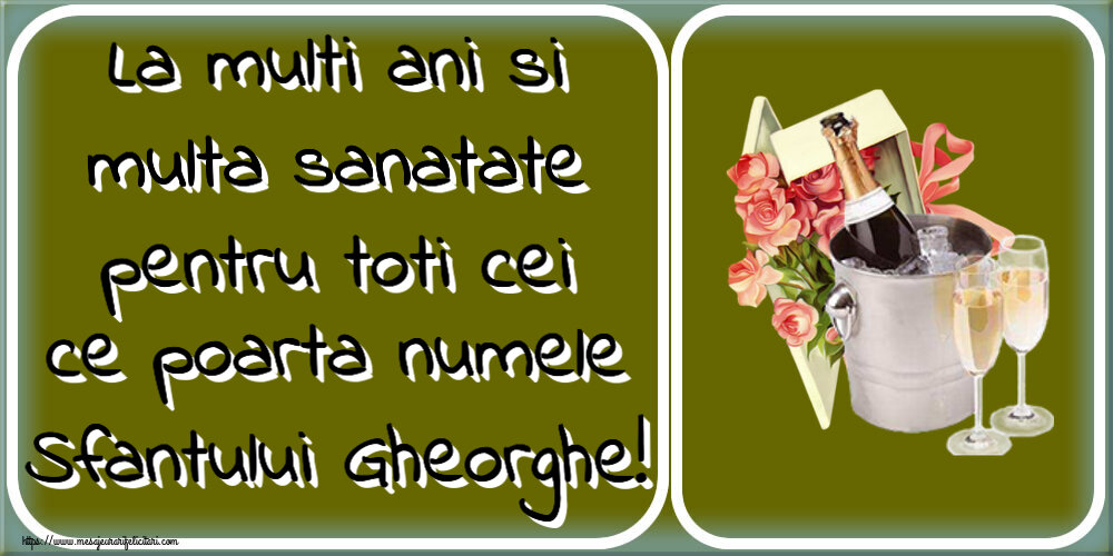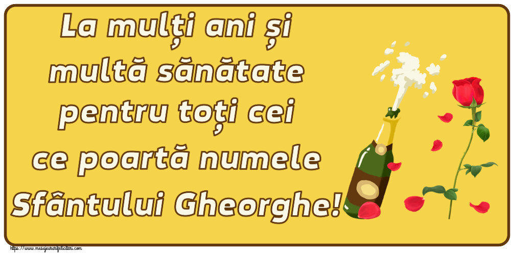 Felicitarea Anterioara Felicitarea Urmatoare Sfantul Gheorghe (602) Felicitari cu flori Felicitari cu sampanie