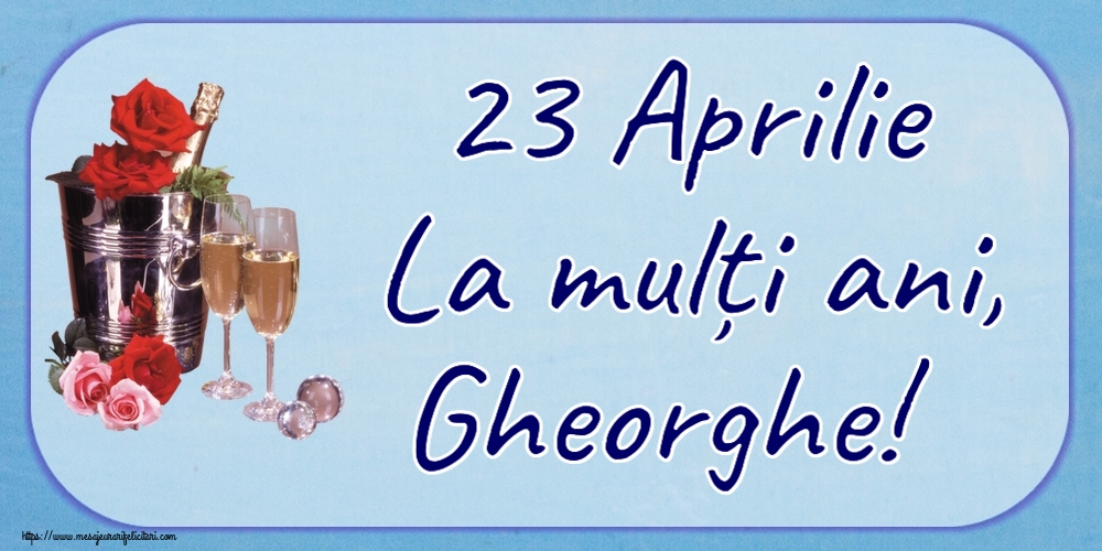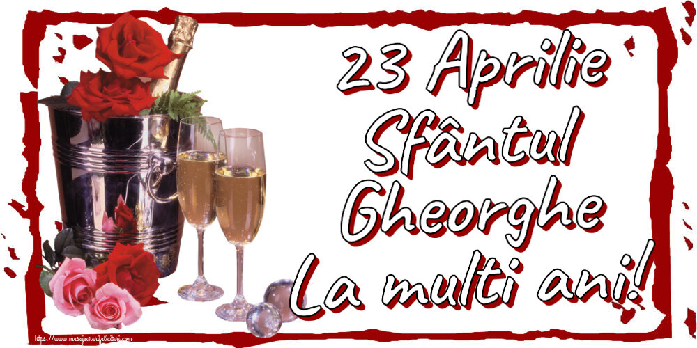 23 Aprilie Sfântul Gheorghe La multi ani! In fiecare an, la 23 aprilie, il praznuim pe Sfantul Mare Mucenic Gheorghe, purtatorul de biruinta. Sfantul Gheorghe s-a nascut in Capadocia, din parinti crestini. Aici gasesti felicitari de sfantul Gheorghe, felicitari pentru cei care poarte numele Sfantului Gheorghe. La multi ani de Sfantul Gheorghe!