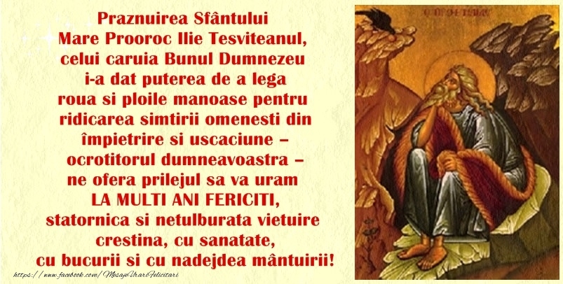 In data de 20 iulie, Biserica Ortodoxa Romana sarbatoreste ridicarea la cer a Sfantului Mare Proroc Ilie, Tesviteanul. Aici gasiti felicitari de sfantul Ilie, imagini de Sfantul Ilie, felicitari pentru cei care poarte numele Sfantului Ilie.
