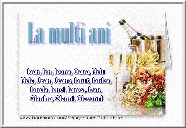 Felicitari pentru Janos, Jean, Jeana, Jeanot, Jovanni, Johanna, Juan, Juana, Juanito, Johan, Iana, Ionut, Ionica, Ionela, Ioana, Ionel, Ioanichie, Ioan, Ion, Ioannis, Ianos, Ivan, Ivana, Gianina, Gianni, Giovanni, Yanni, Yannos, Oana, Onuta, Nelu, Nela, Janina, Jana!