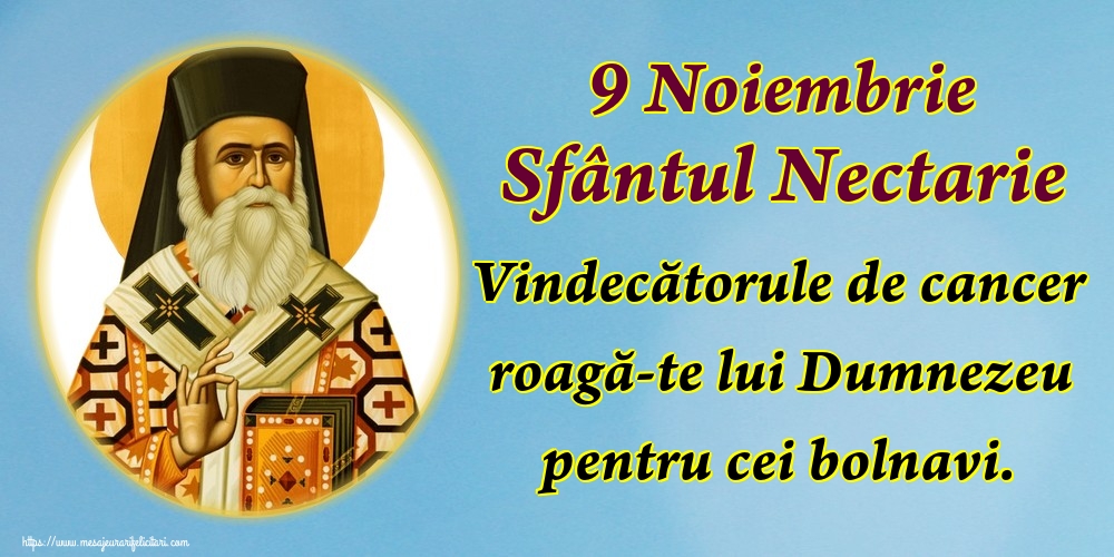 Sfântul Ierarh Nectarie Taumaturgul este prăznuit de Biserica Ortodoxa pe 9 noiembrie. Este considerat făcător de minuni încă din timpul vieții, fiind recunoscut că aduce vindecare bolnavilor de cancer, dar și că ascultă rugăciunile femeilor care nu pot avea copii.