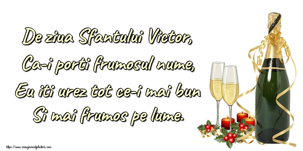De ziua Sfantului Victor, Ca-i porti frumosul nume, Eu iti urez tot ce-i mai bun Si mai frumos pe lume.