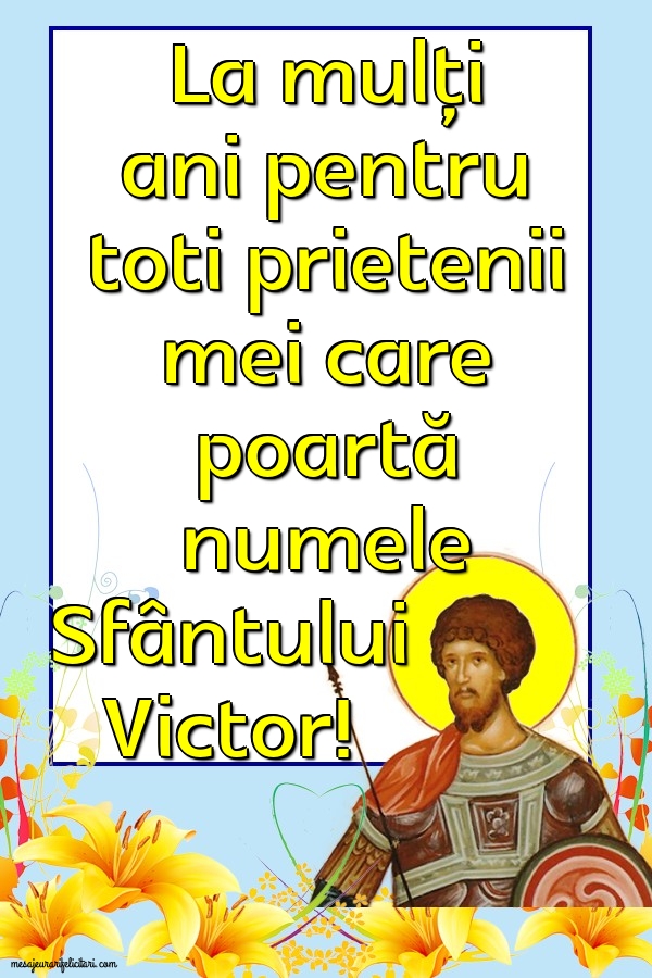 Aici gasiti felicitari de sfantul Victor, felicitari pentru cei care poarte numele Sfantului Victor, felicitari pentru Victor si Victoria