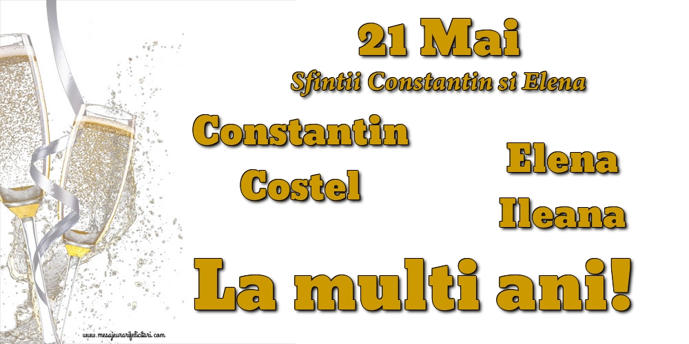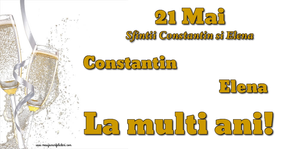 Ortodocsii si catolicii ii serbeaza pe 21 mai pe Sfintii Imparati Constantin si Elena, datorita carora crestinismul a devenit religie permisa, jertfele sangeroase au fost interzise si duminica a fost stabilita zi de odihna in Imperiul Roman. Trimite si tu un gand frumos intr-o felicitare tuturor care porta numele Sfintilor Constantin si Elena!