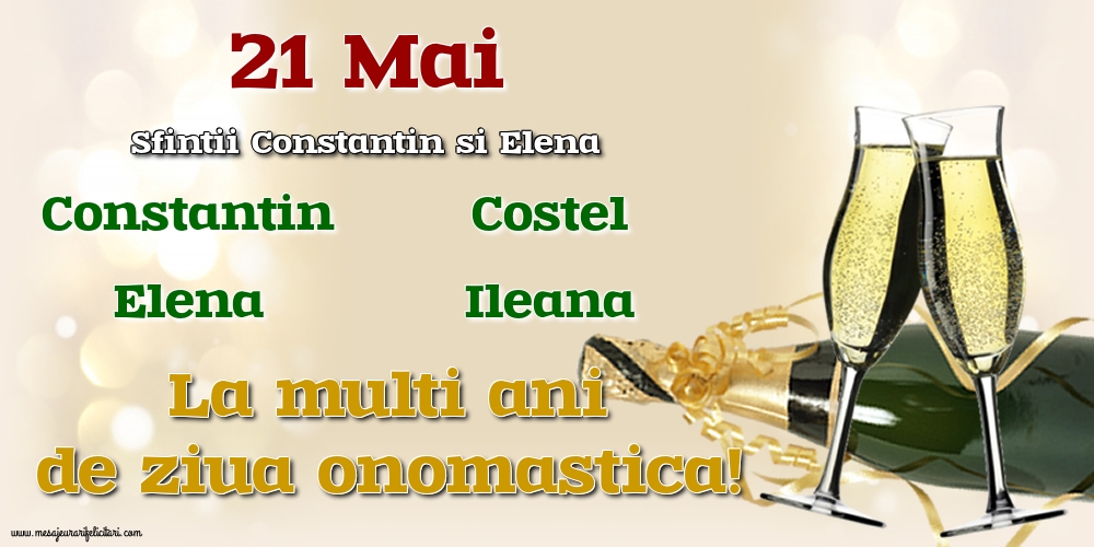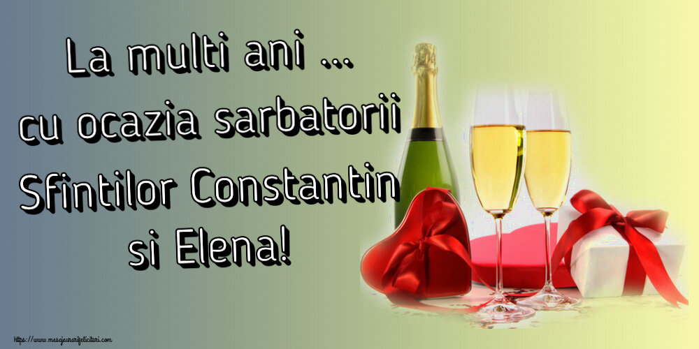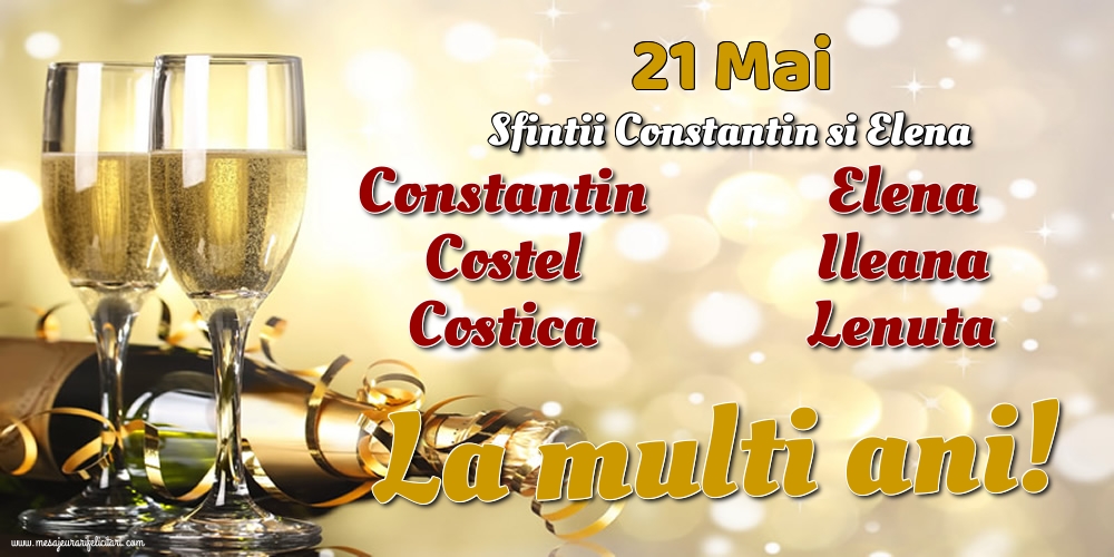 La mulți ani pentru toți cei ce poartă numele Sfinților Constantin și Elena! Ortodocsii si catolicii ii serbeaza pe 21 mai pe Sfintii Imparati Constantin si Elena, datorita carora crestinismul a devenit religie permisa, jertfele sangeroase au fost interzise si duminica a fost stabilita zi de odihna in Imperiul Roman. Trimite si tu un gand frumos intr-o felicitare tuturor care porta numele Sfintilor Constantin si Elena!