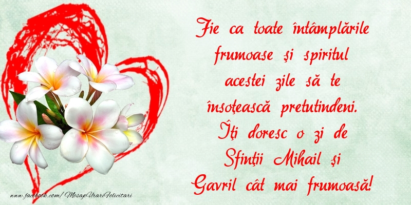 De ziua ce-ti surade-n prag Si-i porti frumosul nume, Eu iti doresc tot ce-i mai drag Si mai frumos pe lume. La multi ani de Sfintii Mihail si Gavriil!