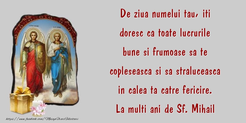 In fiecare an, pe data de 8 noiembrie, Biserica cinsteste Soborul Sfintilor Mihail si Gavriil si a tuturor Puterilor ceresti celor fara de trupuri. Trimite si tu un gand frumos intr-o felicitare tuturor care porta numele Sfintii Mihail si Gavril!