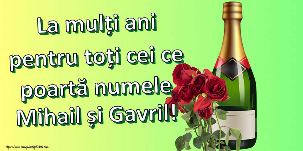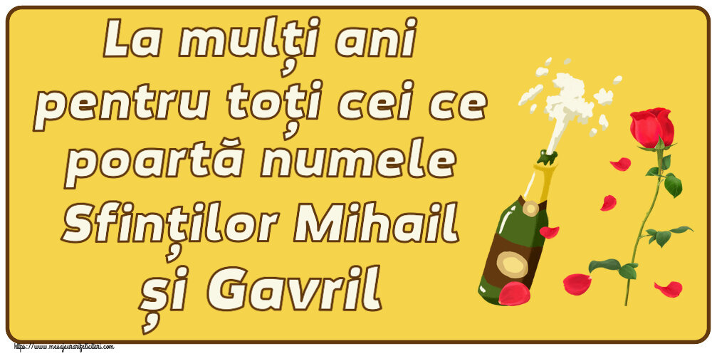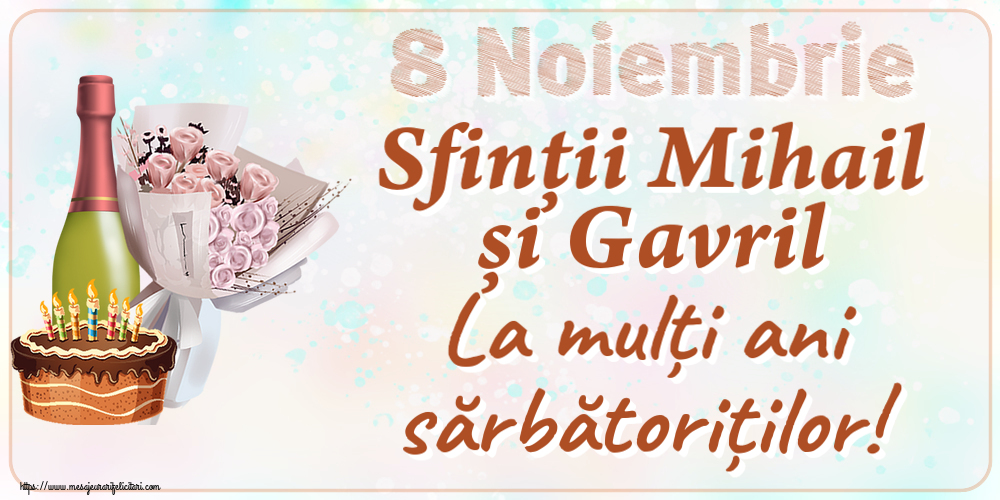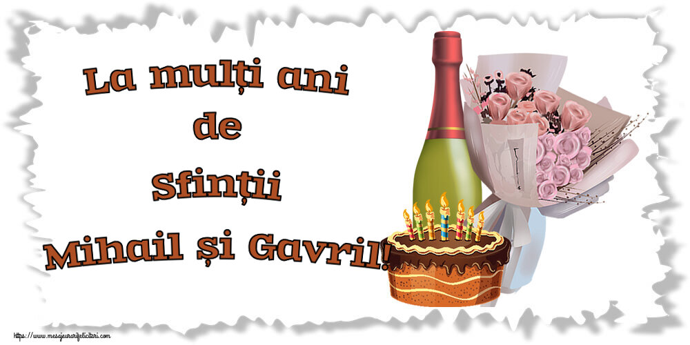 La mulți ani de Sfinții Mihail și Gavril! In fiecare an, pe data de 8 noiembrie, Biserica cinsteste Soborul Sfintilor Mihail si Gavriil si a tuturor Puterilor ceresti celor fara de trupuri. Trimite si tu un gand frumos intr-o felicitare tuturor care porta numele Sfintii Mihail si Gavril! ~ buchet de flori, șampanie și tort