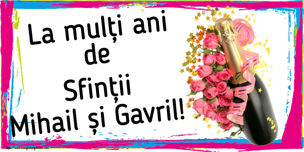 La mulți ani de Sfinții Mihail și Gavril! In fiecare an, pe data de 8 noiembrie, Biserica cinsteste Soborul Sfintilor Mihail si Gavriil si a tuturor Puterilor ceresti celor fara de trupuri. Trimite si tu un gand frumos intr-o felicitare tuturor care porta numele Sfintii Mihail si Gavril! ~ aranjament cu șampanie și flori