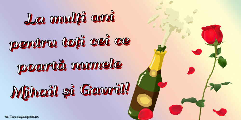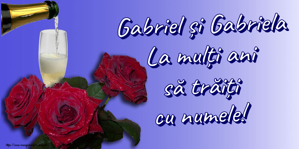 Gabriel și Gabriela La mulți ani să trăiți cu numele! In fiecare an, pe data de 8 noiembrie, Biserica cinsteste Soborul Sfintilor Mihail si Gavriil si a tuturor Puterilor ceresti celor fara de trupuri. Trimite si tu un gand frumos intr-o felicitare tuturor care porta numele Sfintii Mihail si Gavril! ~ trei trandafiri și șampanie
