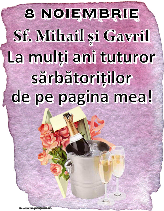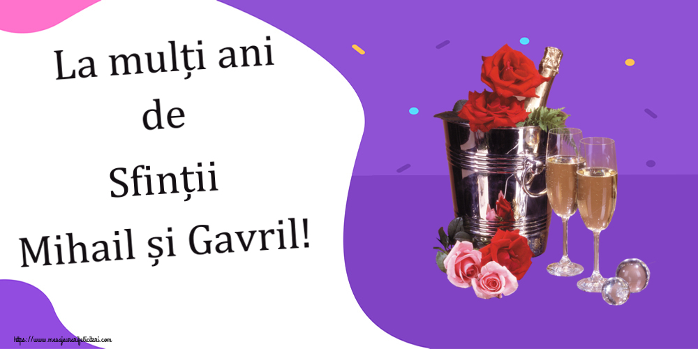 La mulți ani de Sfinții Mihail și Gavril! In fiecare an, pe data de 8 noiembrie, Biserica cinsteste Soborul Sfintilor Mihail si Gavriil si a tuturor Puterilor ceresti celor fara de trupuri. Trimite si tu un gand frumos intr-o felicitare tuturor care porta numele Sfintii Mihail si Gavril! ~ șampanie în frapieră & trandafiri