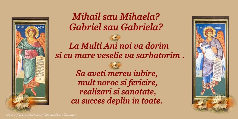 Felicitarea Anterioara Felicitarea Urmatoare Sfintii Mihail si Gavriil (586) Felicitari cu Sfintii Mihail si Gavril Felicitari crestine