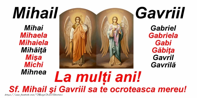 In fiecare an, pe data de 8 noiembrie, Biserica cinsteste Soborul Sfintilor Mihail si Gavriil si a tuturor Puterilor ceresti celor fara de trupuri. Trimite si tu un gand frumos intr-o felicitare tuturor care porta numele Sfintii Mihail si Gavril!