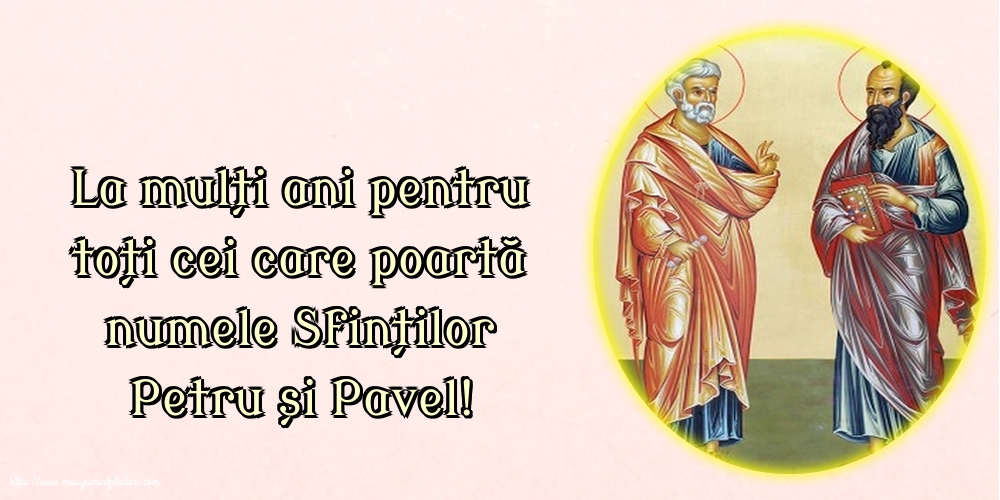 Sfintii Apostoli Petru si Pavel sunt sarbatoriti pe 29 iunie, dupa o perioada de post, care variaza ca durata, in functie de data Sfintelor Pastilor. Trimite si tu un gand frumos intr-o felicitare tuturor care porta numele Sfintilor Apostoli Petru si Pavel!
